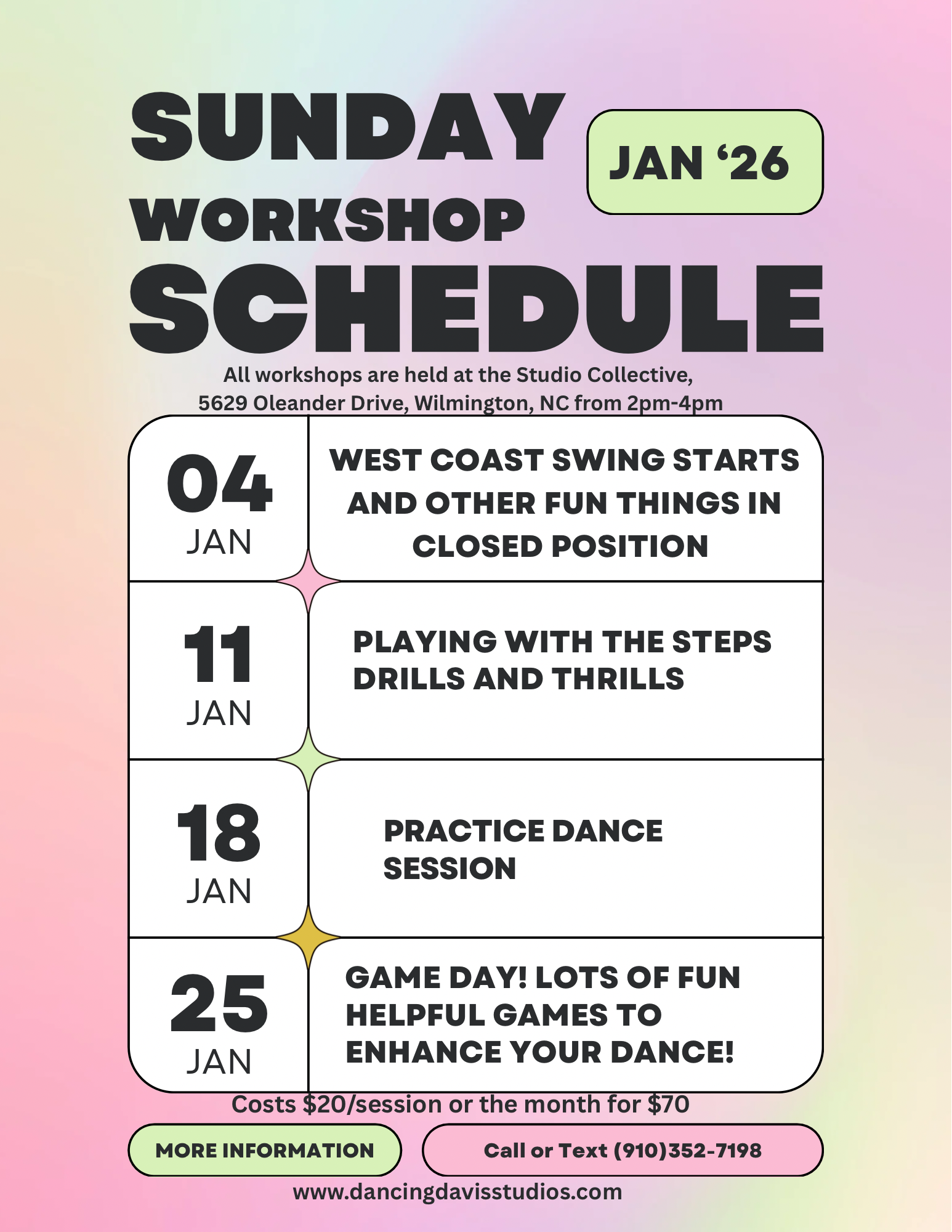 These classes are designed for not only the absolute beginner to novice level dancer and beyond. We offer 4 2hr. sessions held every Sunday from 2pm-4pm. the Location og the classes will be at The Studio Collective, 5629 Oleander Drive, Wilmington, NC. we will typically cover understandings of basic movements, musicality, lead follow roles, and connections within those roles while working with a couple of the basic patterns and variations of the West Coast Swing. see the flyer above for the titles of the weekly classes. Registration required by texting or calling 910-352-7198. Drop ins are welcomed, however, it is encouraged to attend the entire month as each class will be built upon the previous weeks’ class. No experience required, no partner needed. Call now to reserve your spot!